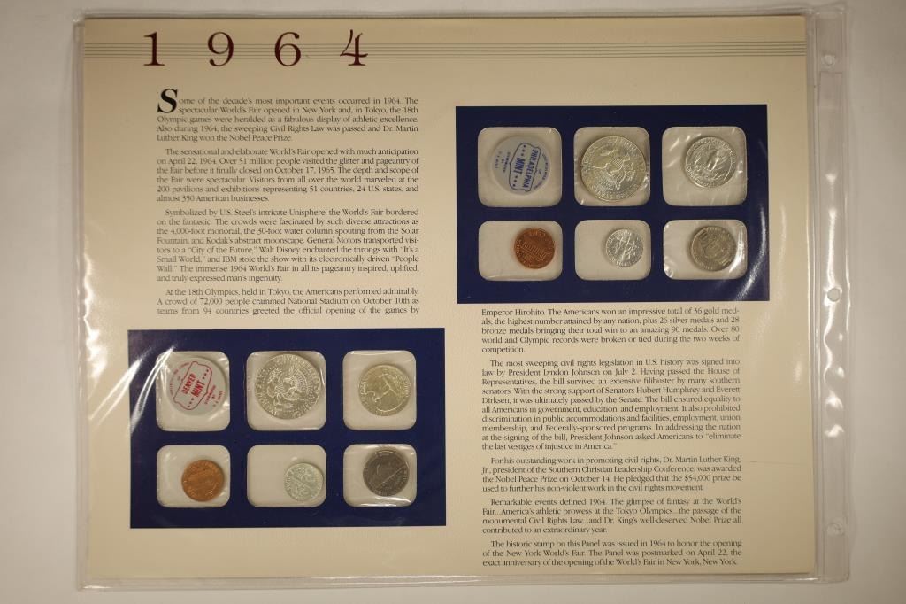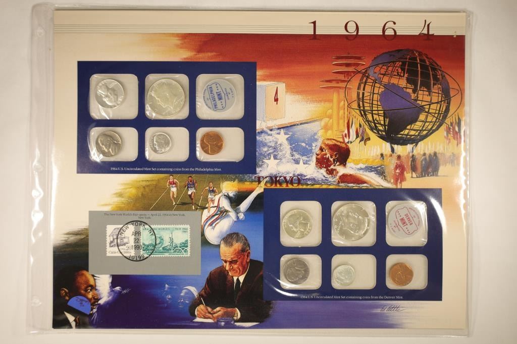 CARDBOARD INFORMATIONAL CARD WITH CANCELLED STAMPS AND IN PLASTIC SLEEVE "OLYMPIC GAMES AND WORLDS FAIR", CONTAINS: 2-90% SILVER KENNEDY HALF DOLLARS