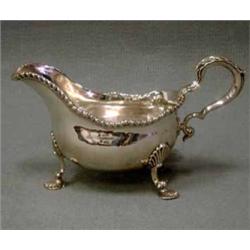 SÅSSNIPA PÅ FYRA TASSFÖTTER MED SNÄCKORNAMENT, UPPSVÄNGD MED HÄNKLAR, KANT MED PÄRLSTAVSDEKOR, LONDON, 1770, H12, L22