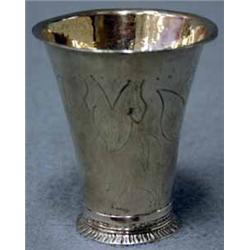 BÄGARE, RÄFFLAD FOTRING, KATTFOT OCH ÅR 1778, SVENSK, MÄSTARSTÄMPEL SAKNAS, LIV MED GRAVERAD DEKOR AV TULPANER, H8
