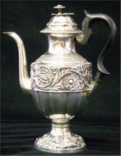 KAFFEKANNA, RUND FOT MED DEKOR AV ROCAILLER, LIV MED BLOMSTERSLINGOR, SVÄNGT SVÄRTAT TRÄHANDTAG, BLOMLOCKKNOPP, SENEMPIR, ABRAHAM EDBORG, JÖNKÖPING 1850, H32