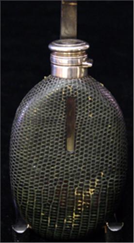 FICKPLUNTA, GLAS, KLÄDD MED GRÖNT ÖDLESKINN, PROPP I SILVER, BIRMINGHAM, TIDIGT 1900-TAL, H14