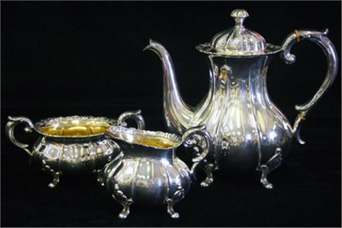 KAFFESERVIS, KANNA, SOCKERSKÅL, GRÄDDKANNA, DEKOR AV KNÄCKAR OCH BLADORNAMENTIK, ROKOKOSTIL, JS, KÖPENHAMN 1938, KANNAN H22 (3)