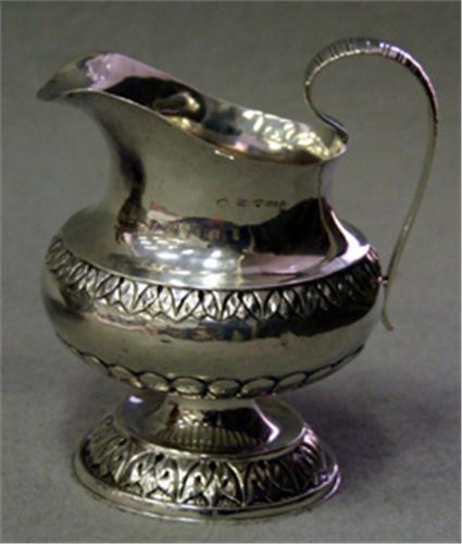 GRÄDDKANNA, RUND FOT, DEKOR AV BLAD OCH GODRONNERINGAR, UPPSVÄNGD HÄNKEL, JOHAN WAHLSTRÖM, JÖNKÖPING 1837, H12 (ÖVRE HÄNKELFÄSTET MED LAGNING)