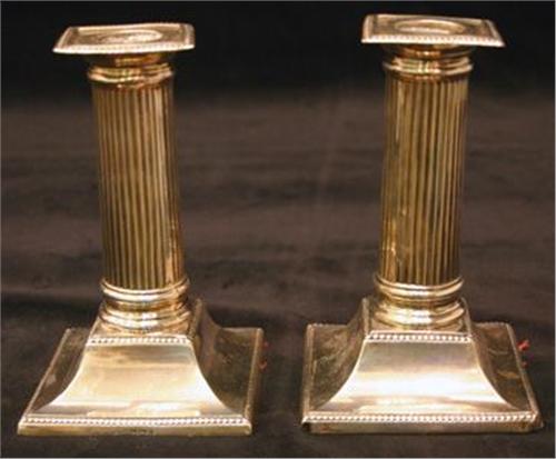 1 PAR KOLONNLJUSSTAKAR, FYRKANTIG BOTTENPLATTA, REFFLAD STAM, PÄRLSTAMSDEKOR, LONDON 1926, H13