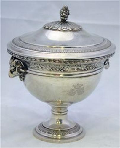 STRÖSOCKERSKÅL, RUND FORM, BLADDEKOR, HÄNKLAR I FORM AV BOCKHUVUDEN, LOCKKNOPP I FORM AV PINJENÖT, EMPIRSTIL, TYSKA STÄMPLAR, H15