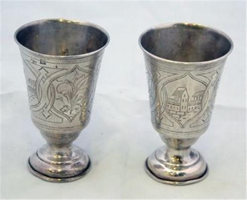 1 PAR SUPKALKAR, GRAVERAD DEKOR AV HUS OCH BLOMMOR, RYSKA STÄMPLAR 1885, H9 (INSKRIPTION) (2)