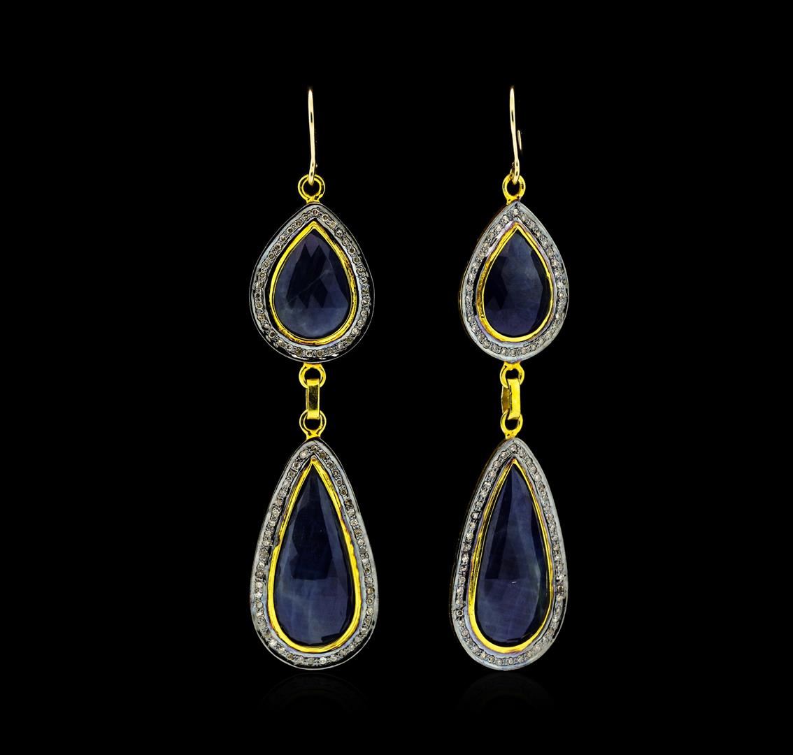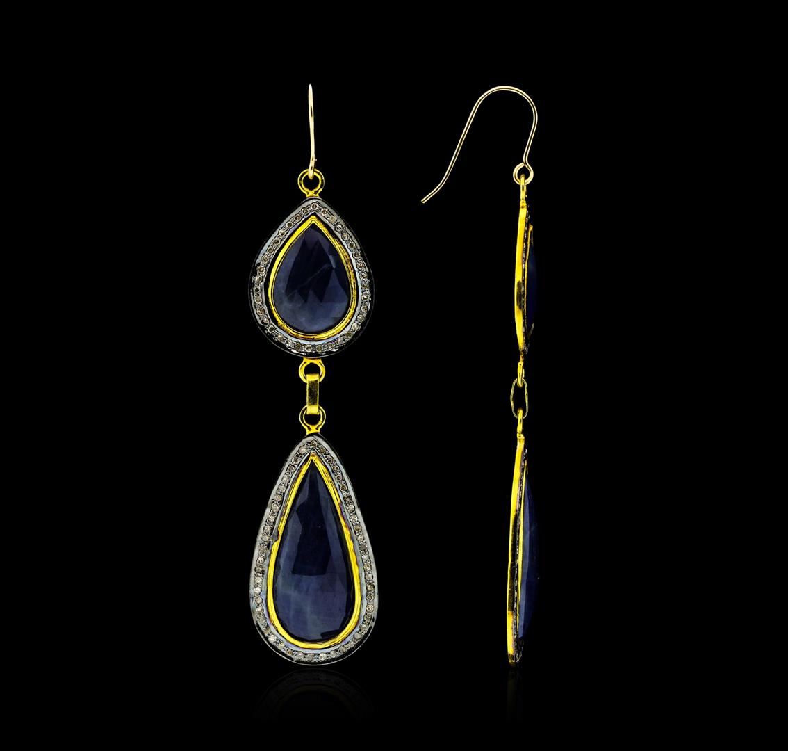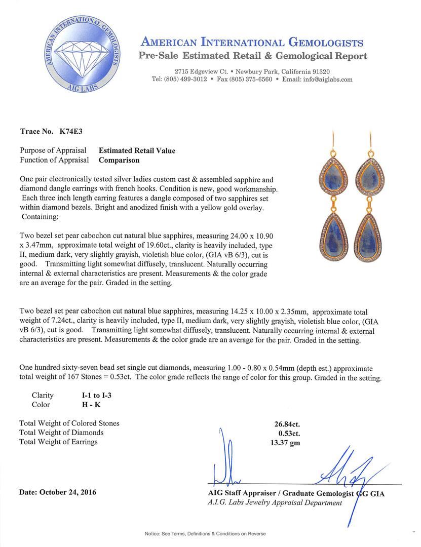 One pair electronically tested silver ladies custom cast & assembled sapphire and diamond dangle earrings with french hooks. Each three inch length earring features a dangle composed of two sapphires set within diamond bezels. Bright and anodized finish with a yellow gold overlay. Condition is new, good workmanship. Containing: Two bezel set pear cabochon cut natural blue sapphires, measuring 24.00 x 10.90 x 3.47mm, approximate total weight of 19.60ct., clarity is heavily included, type II, medium dark, very slightly grayish, violetish blue color, (GIA vB 6/3), cut is good. Transmitting light somewhat diffusely, translucent. Naturally occurring internal & external characteristics are present. Measurements & the color grade are an average for the pair. Graded in the setting.Two bezel set pear cabochon cut natural blue sapphires, measuring 14.25 x 10.00 x 2.35mm, approximate total weight of 7.24ct., clarity is heavily included, type II, medium dark, very slightly grayish, violetish blue color, (GIA vB 6/3), cut is good. Transmitting light somewhat diffusely, translucent. Naturally occurring internal & external characteristics are present. Measurements & the color grade are an average for the pair. Graded in the setting.One Hundred Sixty-Seven bead set single cut diamonds, measuring 1.00 - 0.80 x 0.54mm (depth est.) approximate total weight of 167 Stones = 0.53ct. The color grade reflects the range of color for this group. Graded in the setting. Clarity: I-1 to I-3. Color: H - K. Total Weight of Colored Stones 26.84ct. Total Weight of Diamonds 0.53ct. Total Weight of Earrings 13.37gm. AIG Appraised.