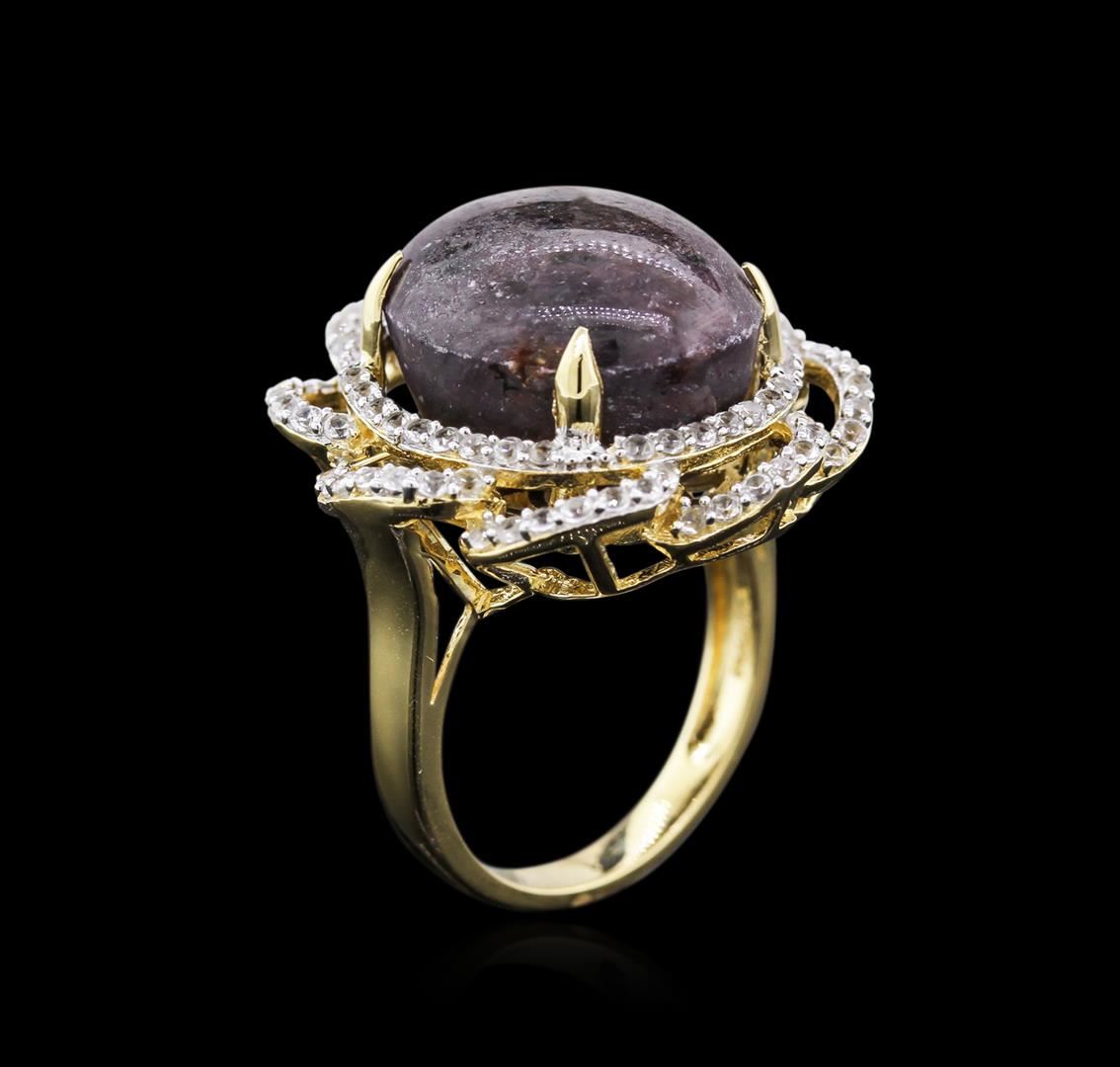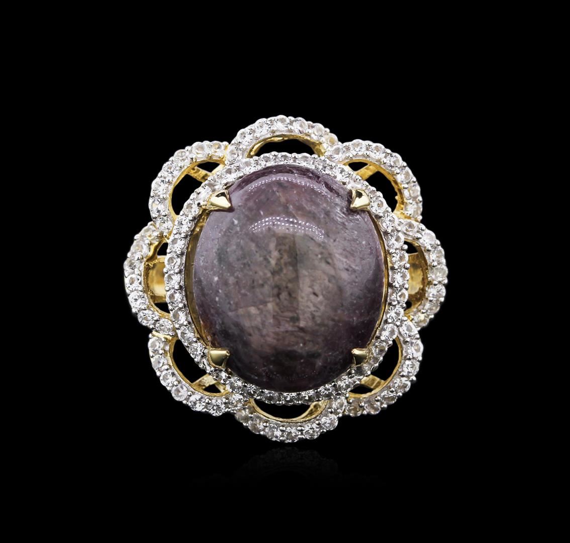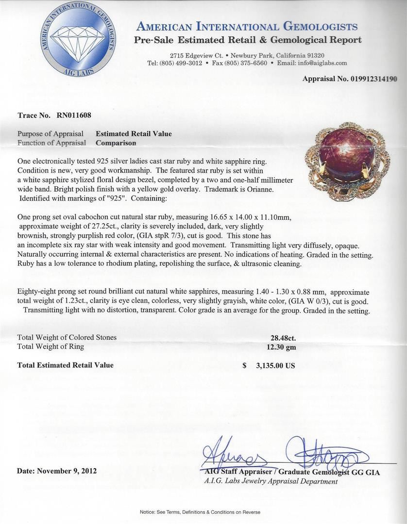 One electronically tested 925 silver ladies cast star ruby and white sapphire ring. Condition is new, very good workmanship. The featured star ruby is set within a white sapphire stylized floral design bezel, completed by a two and one-half millimeter wide band. Bright polish finish with a yellow gold overlay. Trademark is Orianne. Identified with markings of "925". Containing: One prong set oval cabochon cut natural star ruby, measuring 16.65 x 14.00 x 11.10mm, approximate weight of 27.25ct., clarity is severely included, dark, very slightly brownish, strongly purplish red color, (GIA stpR 7/3), cut is good. This stone has an incomplete six ray star with weak intensity and good movement. Transmitting light very diffusely, opaque. Naturally occurring internal & external characteristics are present. No indications of heating. Graded in the setting. Ruby has a low tolerance to rhodium plating, repolishing the surface, & ultrasonic cleaning. Eighty-eight prong set round brilliant cut natural white sapphires, measuring 1.40 - 1.30 x 0.88 mm, approximate total weight of 1.23ct., clarity is eye clean, colorless, very slightly grayish, white color, (GIA W 0/3), cut is good. Transmitting light with no distortion, transparent. Color grade is an average for the group. Graded in the setting. Total Weight of Colored Stones: 28.48ct. Total Weight of Ring: 12.30 gm. AIG Appraised at $3,135.00.