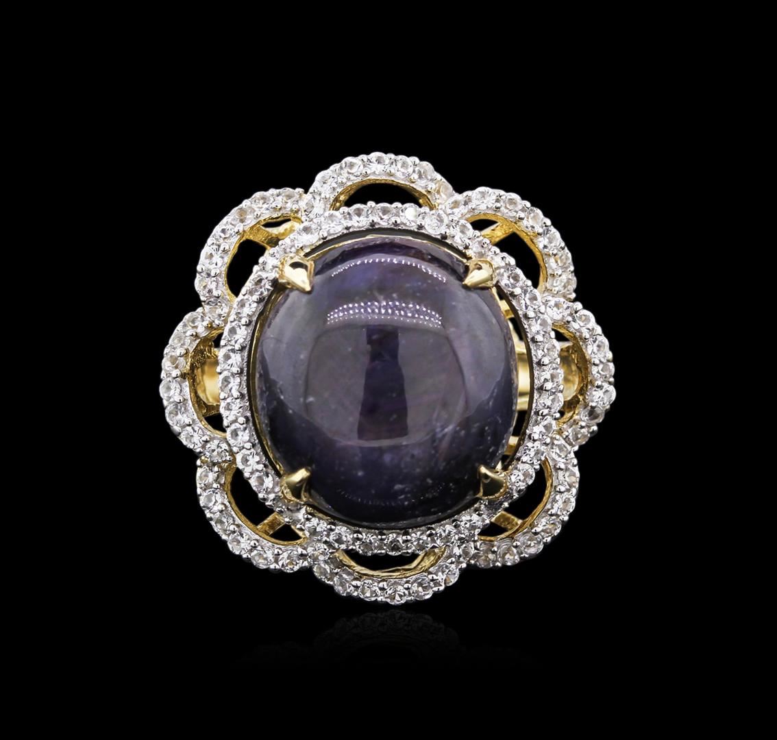 One electronically tested 925 silver ladies cast star ruby and white sapphire ring. Condition is new, good workmanship. The featured star ruby is set within a white sapphire stylized floral design bezel, completed by a two and one-half millimeter wide band. Bright polish finish with a yellow gold overlay. Trademark is Orianne. Identified with markings of "925". Containing: One prong set oval cabochon cut natural star ruby, measuring 15.60 x 14.00 x 10.25mm, approximate weight of 27.26ct., clarity is severely included, dark, very slightly brownish, strongly purplish red color, (GIA stpR 7/3), cut is good. This stone has an incomplete six ray star with weak intensity and fair movement. Transmitting light very diffusely, opaque. Naturally occurring internal & external characteristics are present. No indications of heating. Graded in the setting. Ruby has a low tolerance to rhodium plating, repolishing the surface, & ultrasonic cleaning. Eighty-eight prong set round brilliant cut natural white sapphires, measuring 1.40 - 1.30 x 0.88 mm, approximate total weight of 1.22ct., clarity is eye clean, colorless, very slightly grayish, white color, (GIA W 0/3), cut is good. Transmitting light with no distortion, transparent. Color grade is an average for the group. Graded in the setting. Total Weight of Colored Stones: 28.48ct. Total Weight of Ring: 12.20 gm. AIG Appraised at $3,130.00.