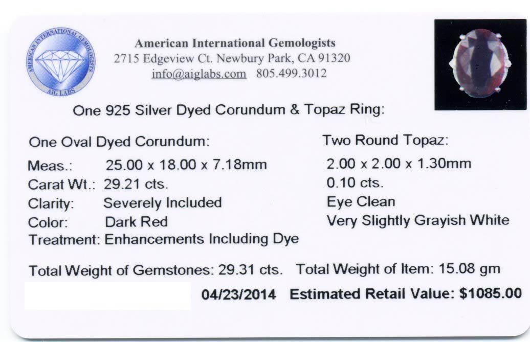 One electronically tested 925 silver ladies cast dyed corundum and white topaz ring with a bright polish finish. The featured dyed corundum is supported by a lattice under gallery and accented by a single white topaz on either side. The ring is completed by a three millimeter wide band. Identified with markings of "925". Condition is new, good workmanship. Containing: One prong set oval mixed cut natural dyed corundum, measuring 25.00 x 18.00 x 7.18mm, 10% bulge factor, approximate weight of 29.21ct, clarity is severely included, dark, very slightly brownish, red color, (GIA R 7/3), cut is good. Transmitting light diffusely, translucent to opaque. Naturally occurring internal & external characteristics are present. Indications of multiple laboratory enhancements, including dye. The presence of dye prevents determining whether or not this stone would have sufficient depth of color to be considered Ruby. Graded in the setting. Two prong set round mixed cut natural white topazes, measuring 2.00 - 2.00 x 1.30 mm, approximate total weight of 0.10ct, clarity is eye clean, colorless, very slightly grayish, white color, (GIA W 0/3), cut is good. Transmitting light with no distortion, transparent. Color grade is an average for the pair. Graded in the setting. Total Weight of Colored Stones 29.31 ct. Total Weight of Ring 15.08 grams AIG Appraised at $1,085.00.