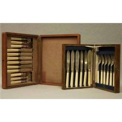 2 BESTICKSCHATULL I TRÄ, 6 KNIVAR, 6 GAFFLAR, N.S BLAD MED BENSKAFT, BLADINFATTNING I SILVER, ENGLAND, 1800-TALETS SENARE DEL (2)