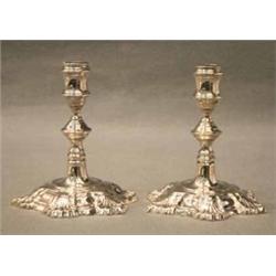 1 PAR LJUSSTAKAR, VÅGIG FOT, DEKOR AV SNÄCKOR, BALUSTERFORMAD STAM, SVÄNGD LJUSPIPA, JOHN CAFE, LONDON 1749, H16