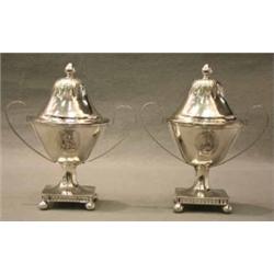 1 PAR STRÖSOCKERSKÅLAR, FYRKANTIG FOTPLATTA MED GALLERVERK, 4 KULFÖTTER, SKÅL MED MEDALJONG, DEKOR AV KVINNA OCH HUND, UPPSVÄNGDA HÄNKLAR, LOCK MED BLADDEKOR, KULFORMAD LOCKKNOPP, ERIK LEMON, UPPSALA 1794, H24 (2)