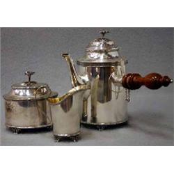 KAFFESERVIS, 3 DELAR, KAFFEKANNA MED SVARVAT RAKT HANDTAG, SOCKERSKÅL OCH GRÄDDKANNA PÅ TASSFÖTTER, PÄRLSTAVDEKOR, LOCKKNOPPAR I FORM AV BLOMMOR, GUSTAVIANSK STIL, GAB, UPPSALA 1970, KANNAN H22