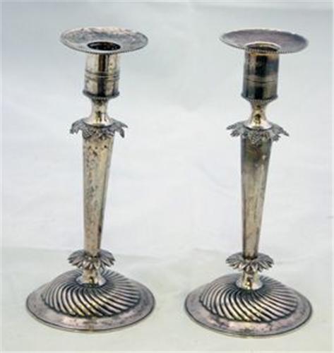 1 PAR LJUSSTAKAR, GODRONNERAD FOT, STAM MED BLADDEKOR, EMPIR, OTYDLIG MÄSTARSTÄMPEL, STOCKHOLM 1827, H18 (2)