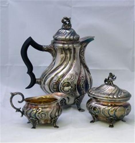 KAFFESERVIS, ROKOKOFORM, KANNA MED SVÄNGT SVÄRTAT HANDTAG, SOCKERSKÅL, GRÄDDKANNA, CG HALLBERG, STOCKHOLM 1948, KANNAN H26