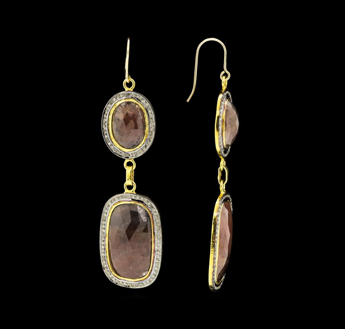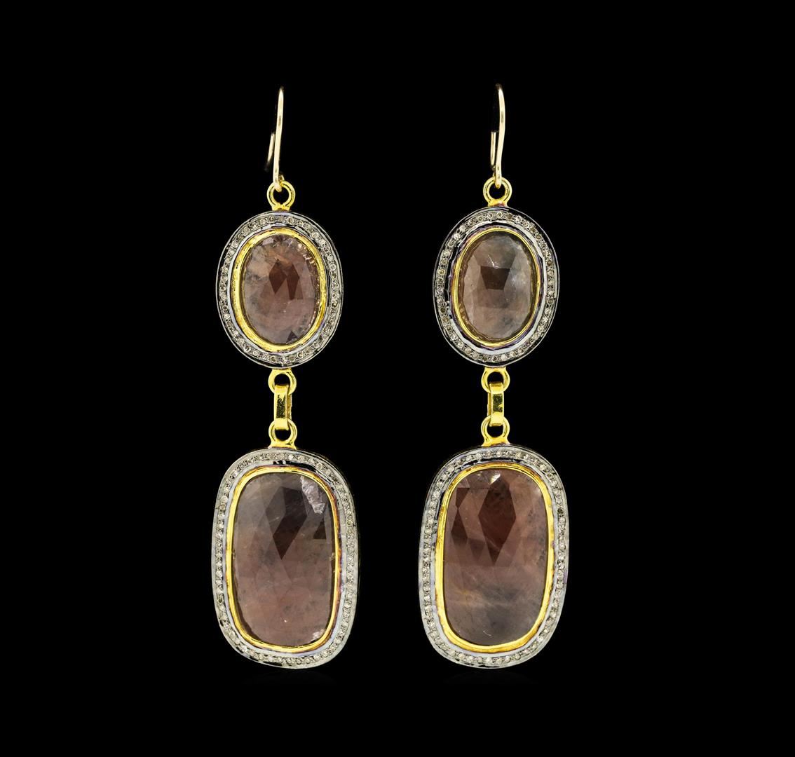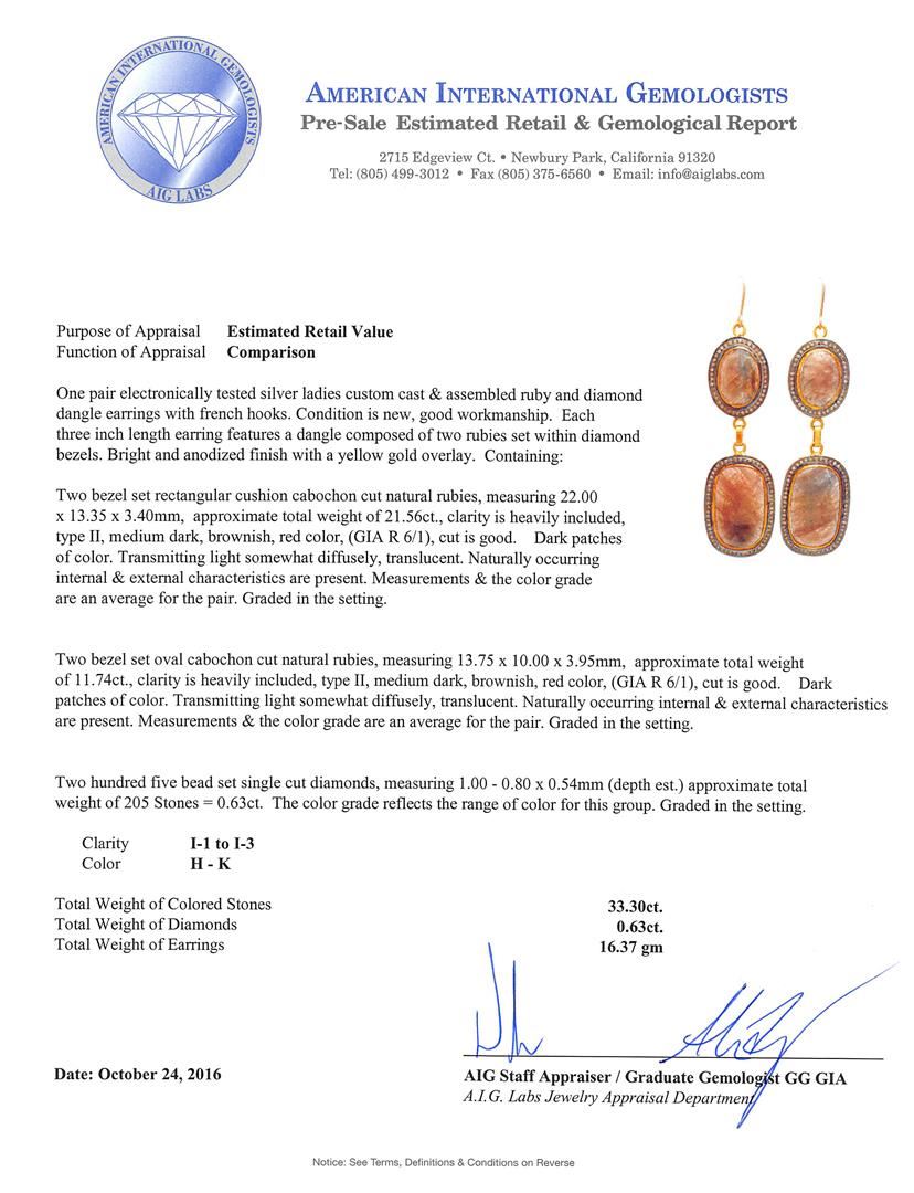 One pair electronically tested silver ladies custom cast & assembled ruby and diamond dangle earrings with French hooks. Condition is new, good workmanship. Each three inch length earring features a dangle composed of two rubies set within diamond bezels. Bright and anodized finish with a yellow gold overlay. Containing: Two bezel set rectangular cushion cabochon cut natural rubies, measuring 22.00 x 13.35 x 3.40mm, approximate total weight of 21.56ct., clarity is heavily included, type Il, medium dark, brownish, red color, (GIA R 6/1), cut is good. Dark patches of color. Transmitting light somewhat diffusely, translucent. Naturally occurring internal & external characteristics are present. Measurements & the color grade are an average for the pair. Graded in the setting. Two bezel set oval cabochon cut natural rubies, measuring 13.75 x 10.00 x 3.95mm, approximate total weight of 11.74ct., clarity is heavily included, type Il, medium dark, brownish, red color, (GIA R 6/1), cut is good. Dark patches of color. Transmitting light somewhat diffusely, translucent. Naturally occurring internal & external characteristics are present. Measurements & the color grade are an average for the pair. Graded in the setting. Two hundred five bead set single cut diamonds, measuring 1.00 - 0.80 x 0.54mm (depth est.) approximate total weight of 205 Stones = 0.63ct. The color grade reflects the range of color for this group. Graded in the setting. Clarity of I-1 to I-3 and color of H-K. Total weight of colored stones is 33.30cts. Total weight of diamonds is 0.63cts. Total weight of the earrings are 16.37gm. AIG Appraised.