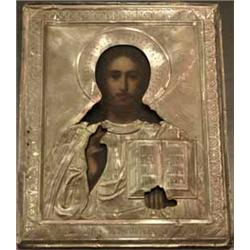 IKON MED SILVERIZZA, JESUS HÅLLANDE BIBEL, RYSSLAND, 18/1900-TAL, H22, B18