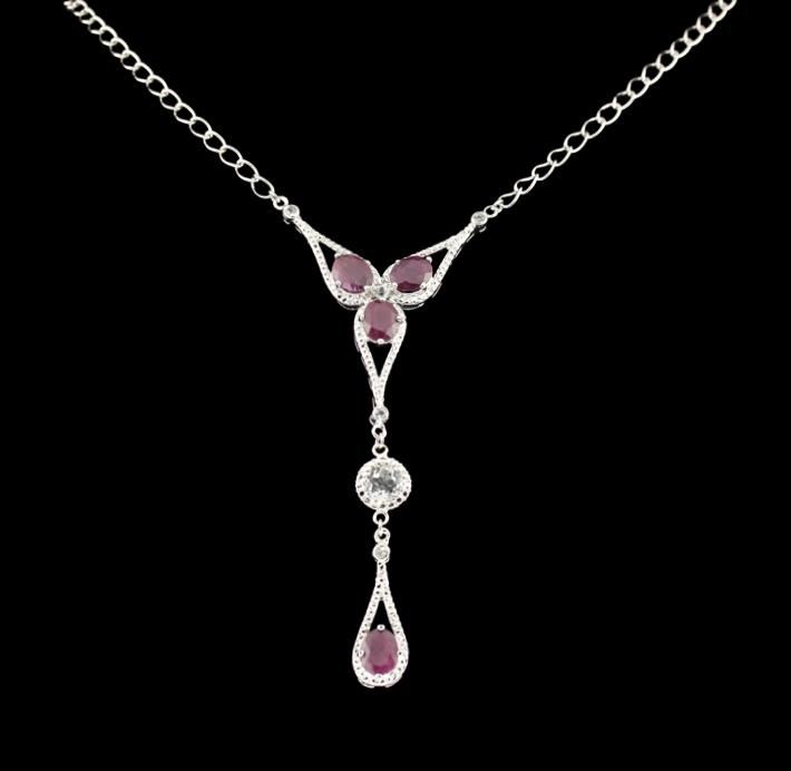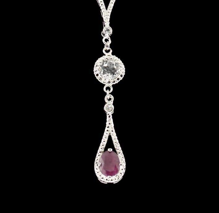 One 925 ruby and white topaz necklace containing:4 oval rubies measuring 9.00 x 7.00 x 3.90mm, carat weight 8.40cts,. Clarity severely included, and color is slightly purplish red. Treatment is glass & flux. This necklace also contains 6 round white topaz in various shapes and sizes. carat weight is 2.25cts., clarity is eye clean, color is slightly grayish white. Total weight of gemstones: 10.65cts., total weight of necklace is 16.97 grams. AIG Appraised at $1,605.00.