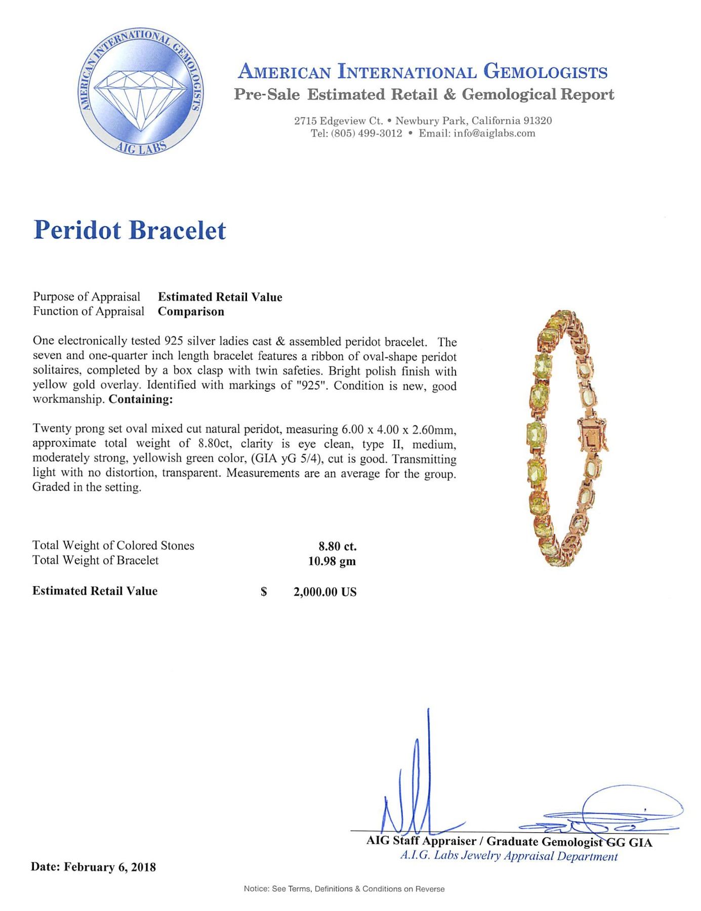 One SILVER 8.80ctw Peridot Bracelet. (12) Peridot stones with a total weight of 8.80cts. Total weight of this bracelet is 10.98 grams.