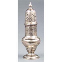 A George II style baluster caster, on spreading pedestal foot, the tall pull-off pierced cover with vase finial, 8in high, C. J. Vander Ltd, London 1969, 8oz
