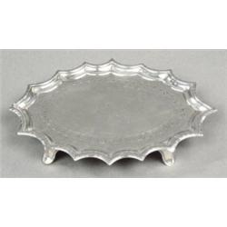 SILVER - A George III boldly scalloped oval teapot stand, on reeded feet, engraved initial withi...
