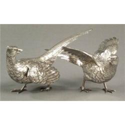 SILVER - A pair of well modelled figures of pheasants, 9.5in long, import marks London 1963, 19o...