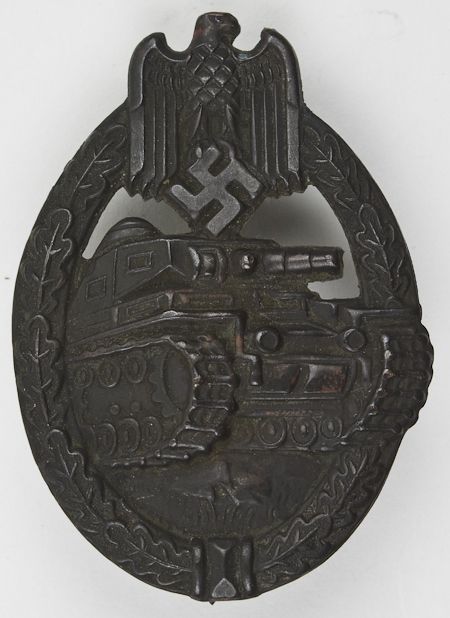 Lot of two Panzer Assault Badges, hollow-backed and unmarked, both in generally very good condition. The silver badge criteria originally required the awardee to have taken part in three armored assaults on three different days or to have been wounded in an assault. The bronze class was presented to the Panzer-Grenadier regiments, tank assault crew, armored recon units, and medical personnel who went into battle in armored vehicles.