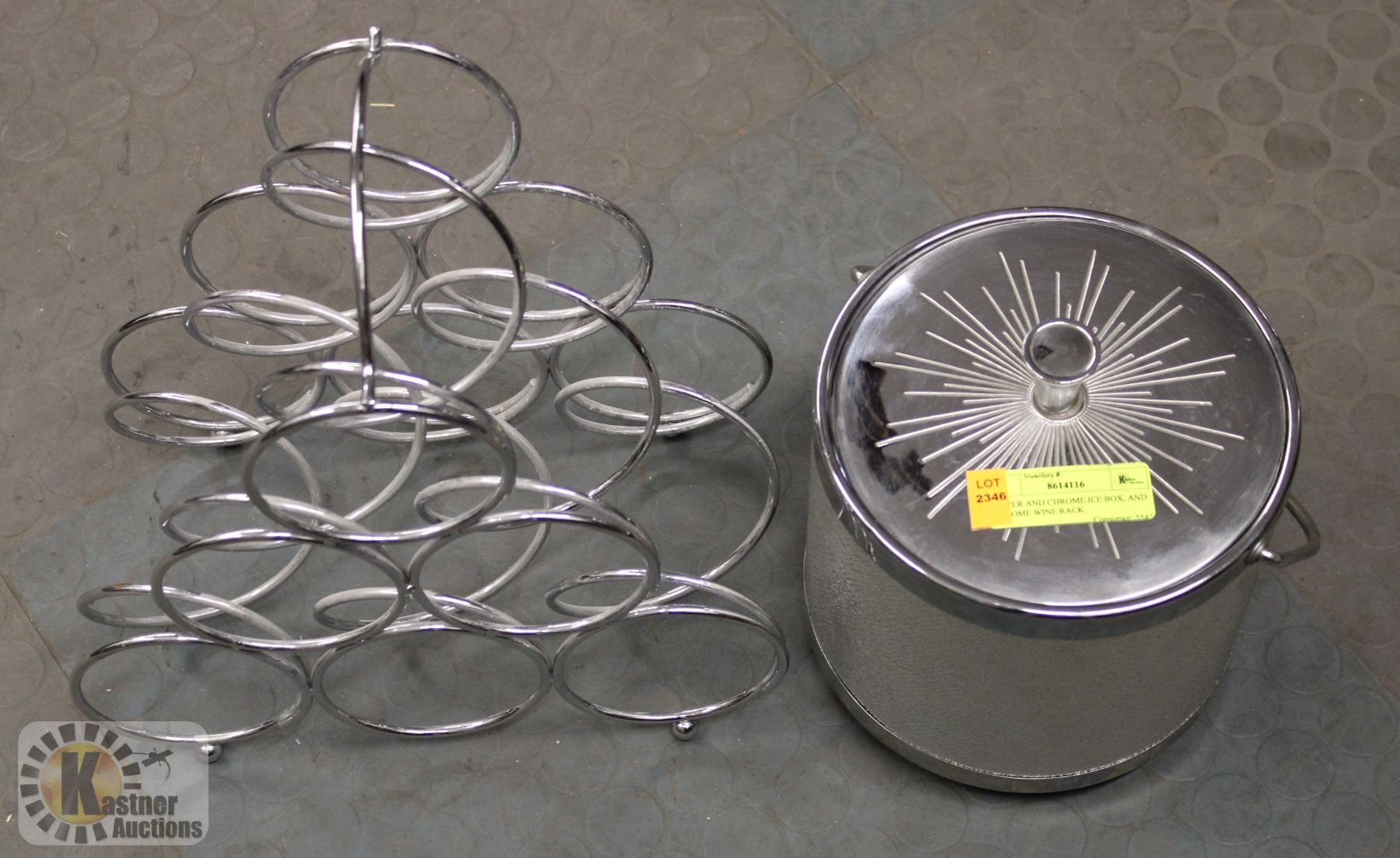 SILVER AND CHROME ICE BOX, AND CHROME WINE RACK
