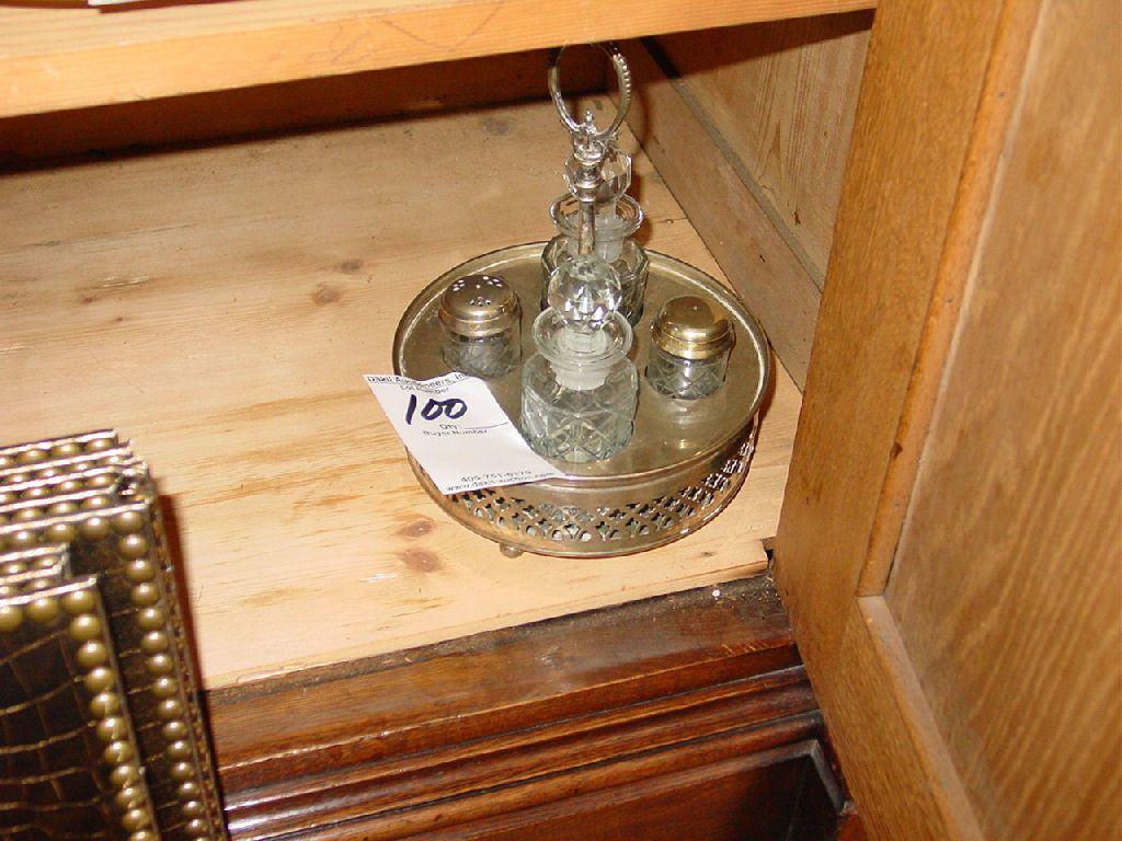 SILVER AND CRYSTAL VINEGAR AND OIL AND SALT AND PEPPER CADDY