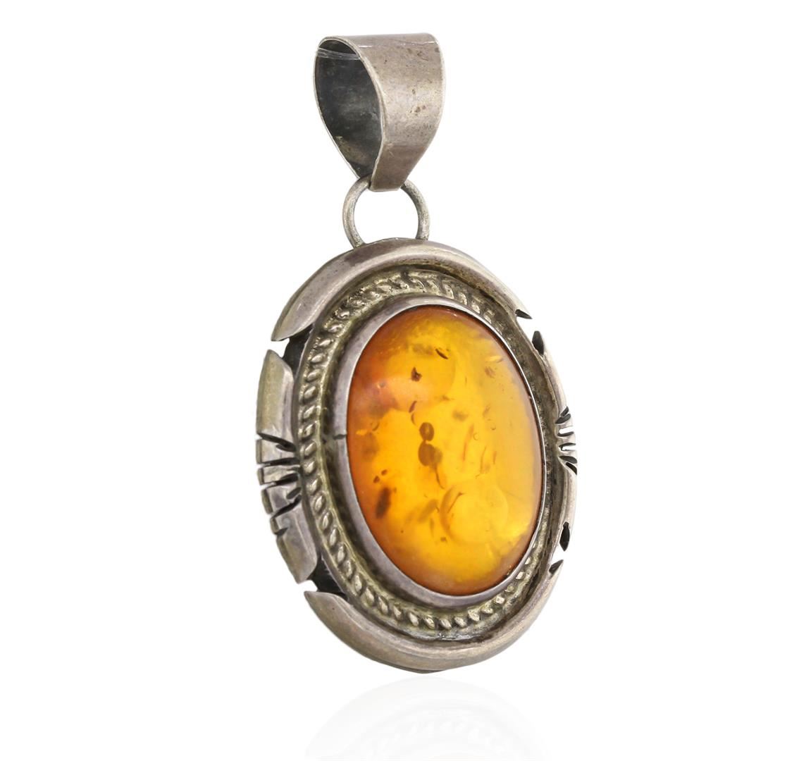 This is a Navajo pendant by designer Jon McCray. It is Sterling Silver with an Amber Cabochon. Stunning Native American Jewelry collectible. Approx. measurements: 2" Long x 1.20" Wide. Handmade! One of a kind!