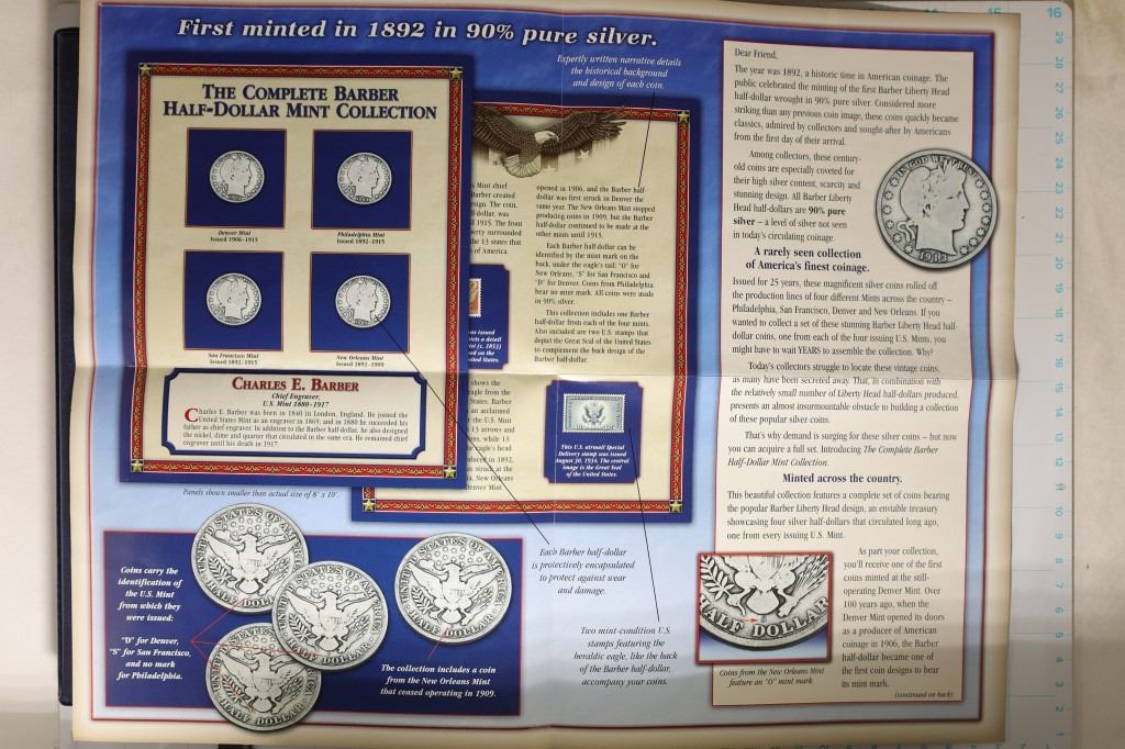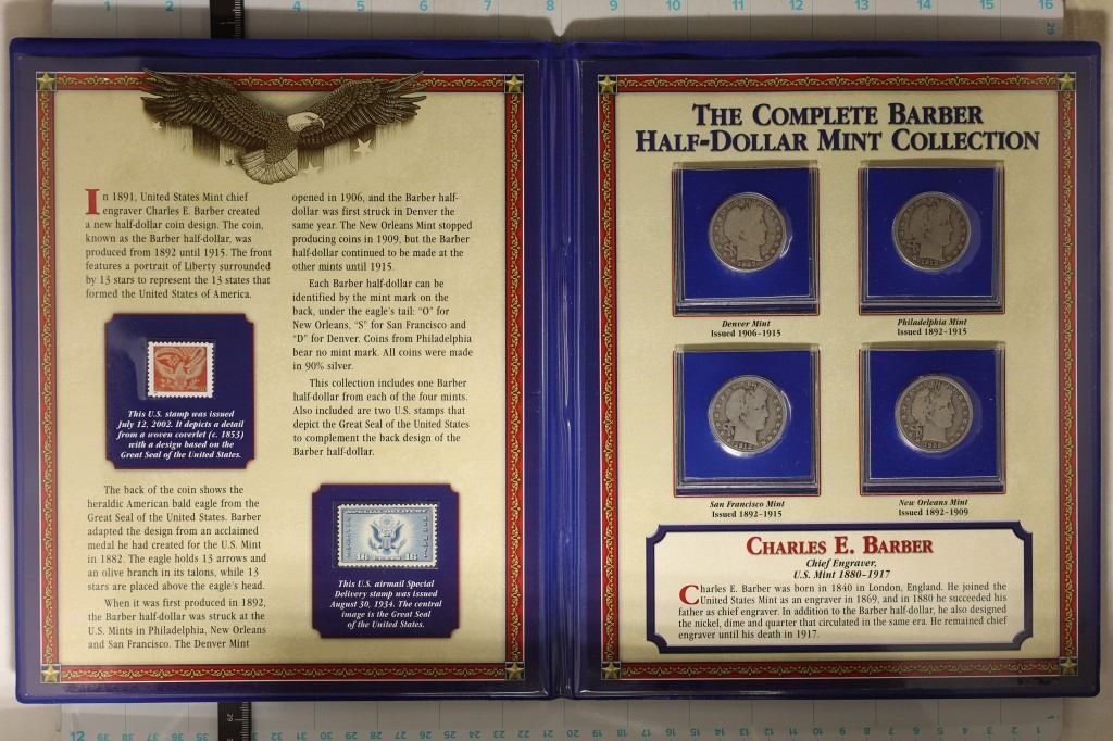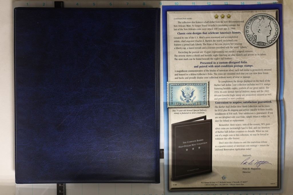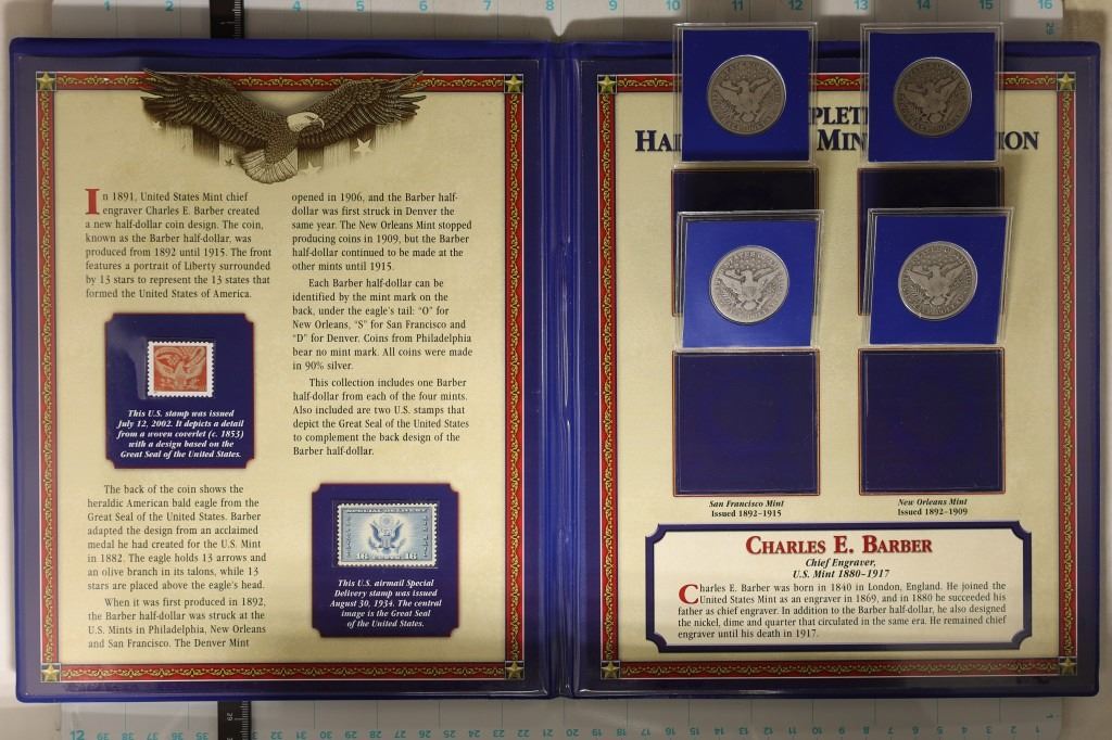 IN BLUE INFO FOLIO CONTAINS: 1907-D, 1912-P, 1912-S AND 1906-O HALF DOLLARS AND A 16 CENT AND 60 CENT UNCANCELLED STAMPS