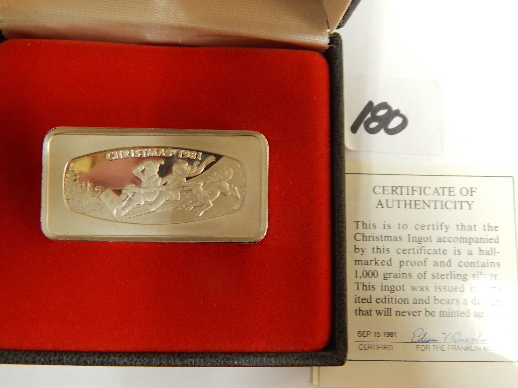 1981 CHRISTAMS 'FIRST SNOW' THE FRANKLIN MINT ' 1000 GRAIN STERLING SILVER BAR
