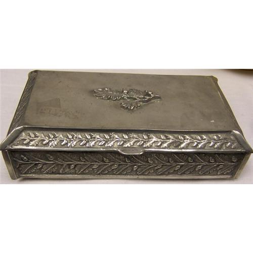 THIS IS A SILVER BOX MADE IN PORTUGAL. IT HAS A 95 PERCENT SIGN ON THE BOTTOM AND THE WORD MEDIEVAL. IT HAS AN OAK LEAF ON THE TOP OF THE BOX AND OAK LEAVES GOING AROUND THE SIDES. I DO NOT BELIEVE IT IS AN OLD BOX BUT, IT IS VERY NICE. YOU SILVER COLLECTOR'S , CHECK THIS OUT!!!
