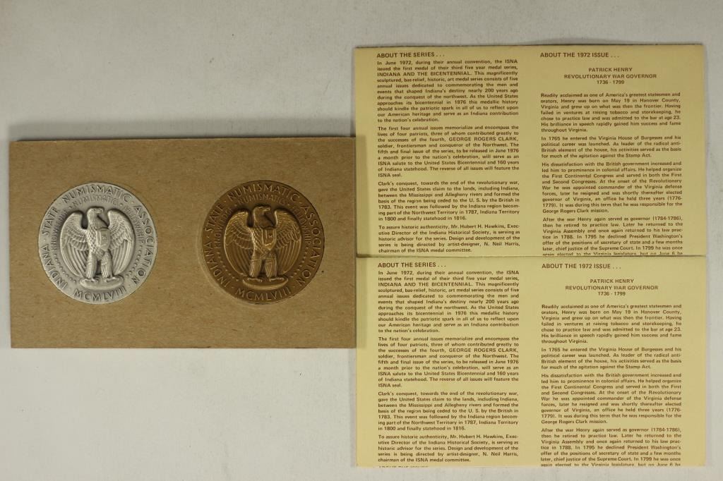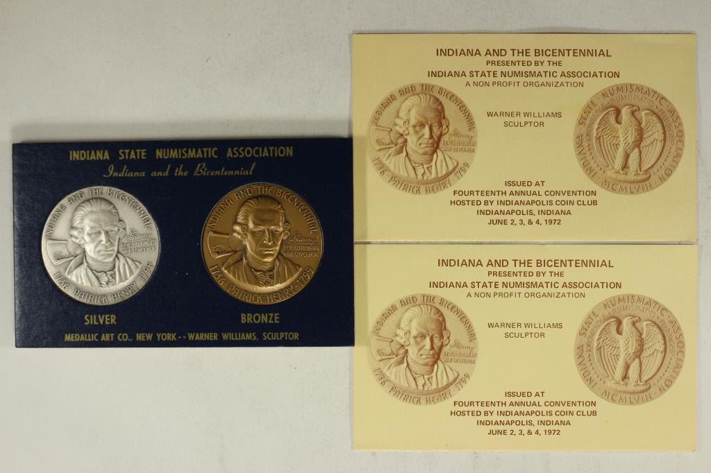 ''INDIANA AND THE BICENTENNIAL" PRESENTED BY THE INDIANA STATE NUMISMATIC ASSOCIATION 1972, 57.3 GRAMS .999 SILVER AND 48.1 GRAM BRONZE