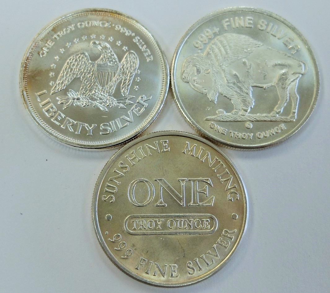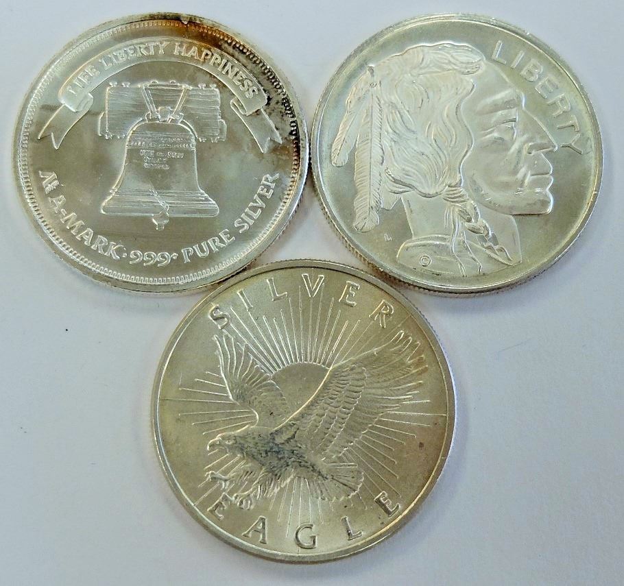 3 SILVER ROUNDS, SUNSHINE, INDIAN/BUFFALO, LIBERTY BELL/EAGLE. ALL PURE ONE OUNCE
