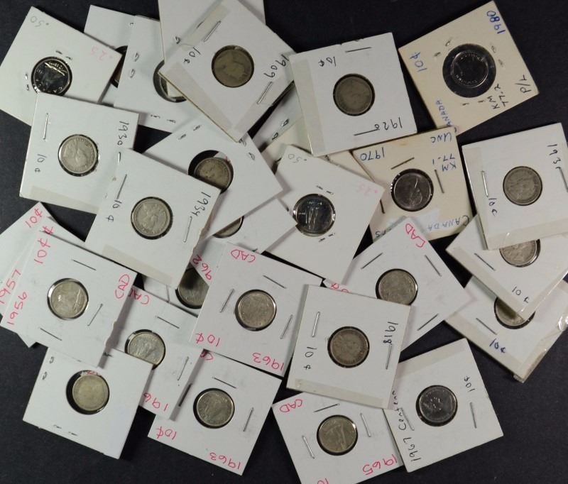 SILVER CANADA DIME LOT, 1874 G, 1902H VG, ( 13 ) 1906-1934 & ( 9 ) 1956-1968
