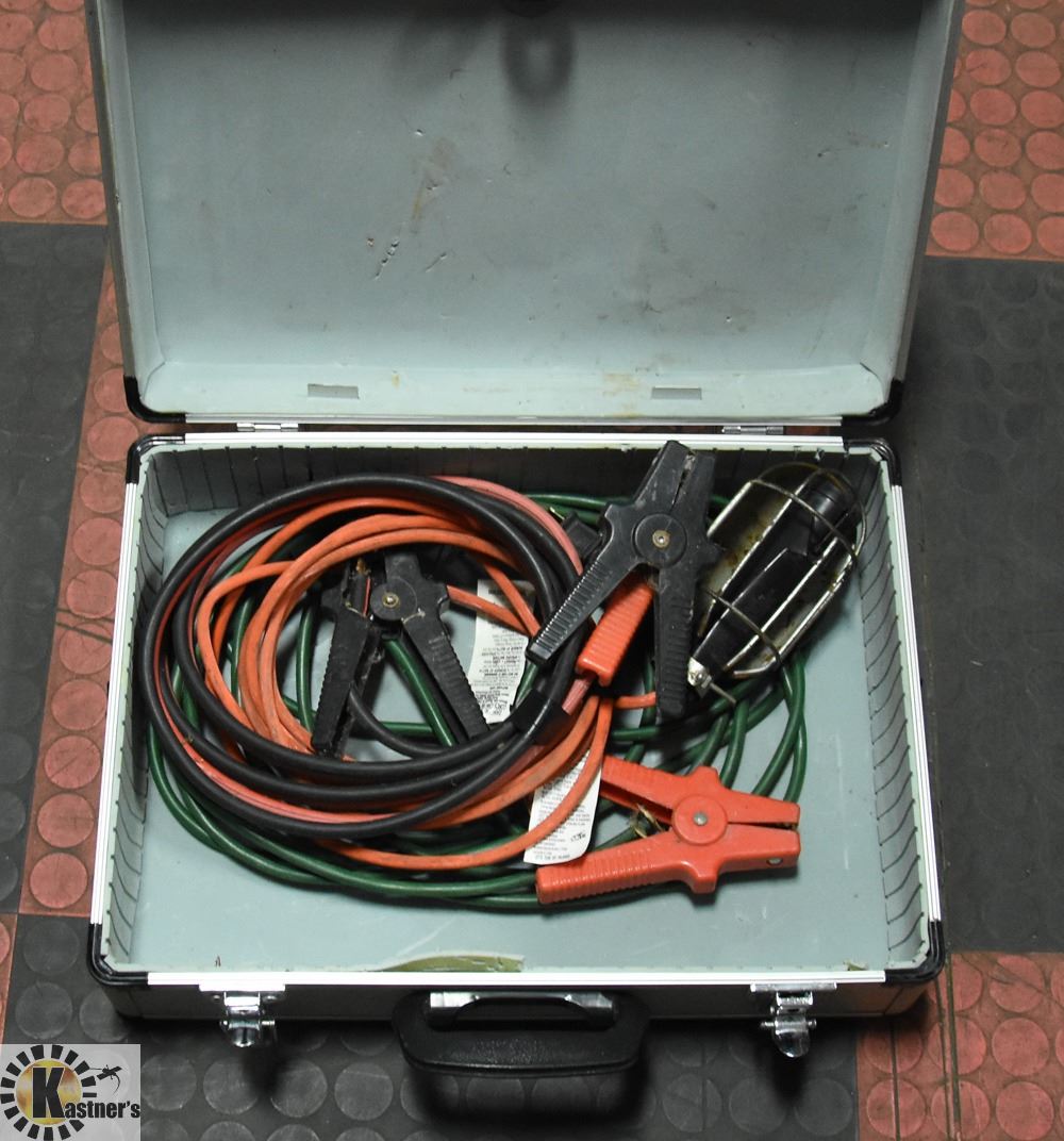 SILVER CASE WITH BOOSTER CABLES & TROUBLE LIGHT
