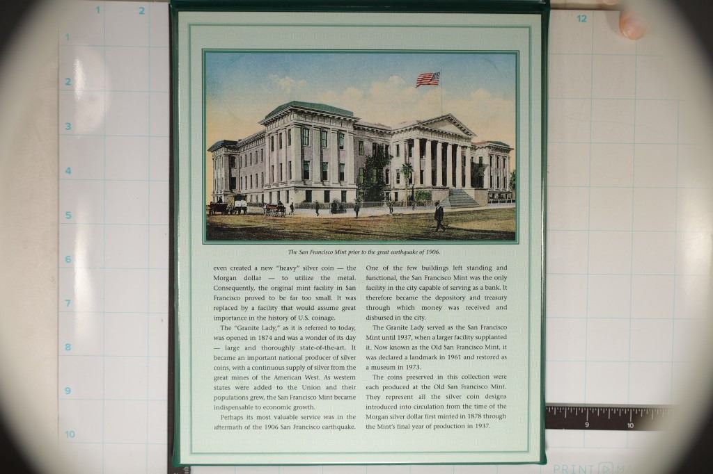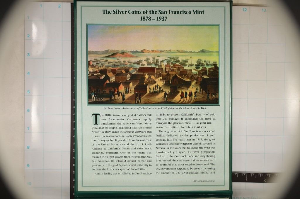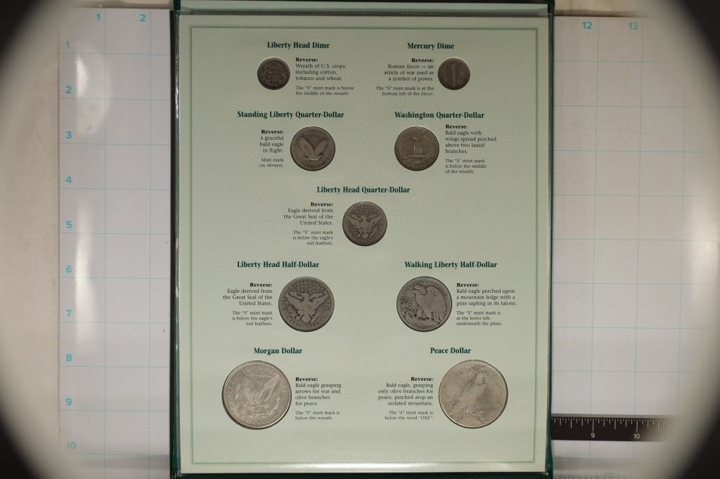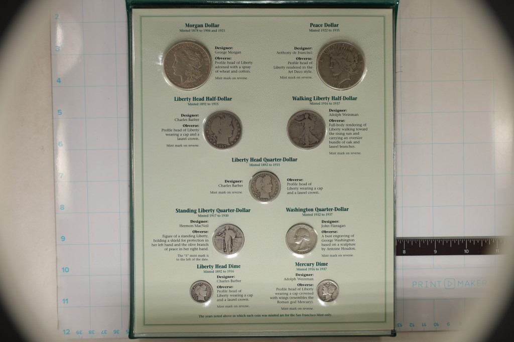 IN GREEN FOLIO WITH INFO CARD, INCLUDES 1921 MORGAN SILVER DOLLAR, 1922 PEACE SILVER DOLLAR, 1907 SILVER BARBER HALF DOLLAR, 1917 SILVER WALKING LIBERTY HALF DOLLAR, 1911 SILVER BARBER QUARTER, 1928 SILVER STANDING