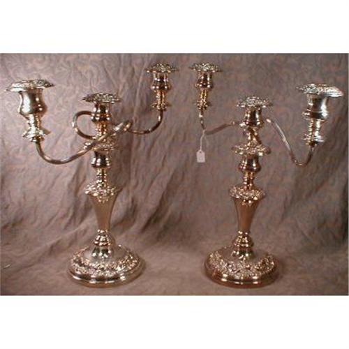 Great pair of English 3 light candelabras. This handsome pair each has a detachable branch so they can be used as single-light candlesticks. Decorated with vines and swags.<p>Marked - SILVER ON COPPER, MADE IN ENGLAND, as seen in photo.