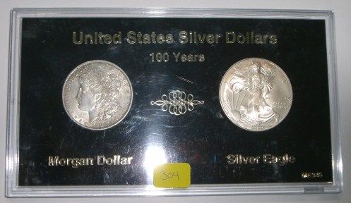 SILVER DOLLAR *100 YEARS* 1900 MORGAN & 2000 SILVER EAGLE SET!! *2 COIN SET COMES IN HARD DISPLAY CASE* SILVER DOLLAR SET CAME OUT OF SAFE!! ***Coin, Currency & All Items Listed in this auction - Grades, Conditions and Values are not Safe Deposit Coins LLC Responsibilty. Grades, Condition and Values are determined by Consigner(s) & Buyers ONLY