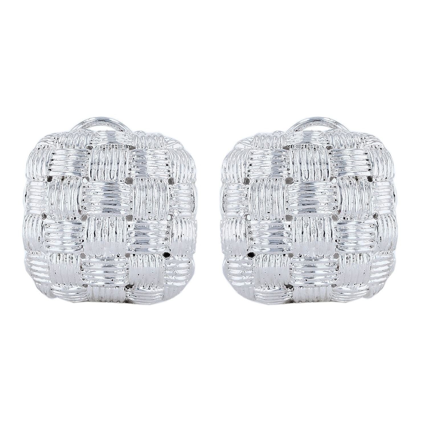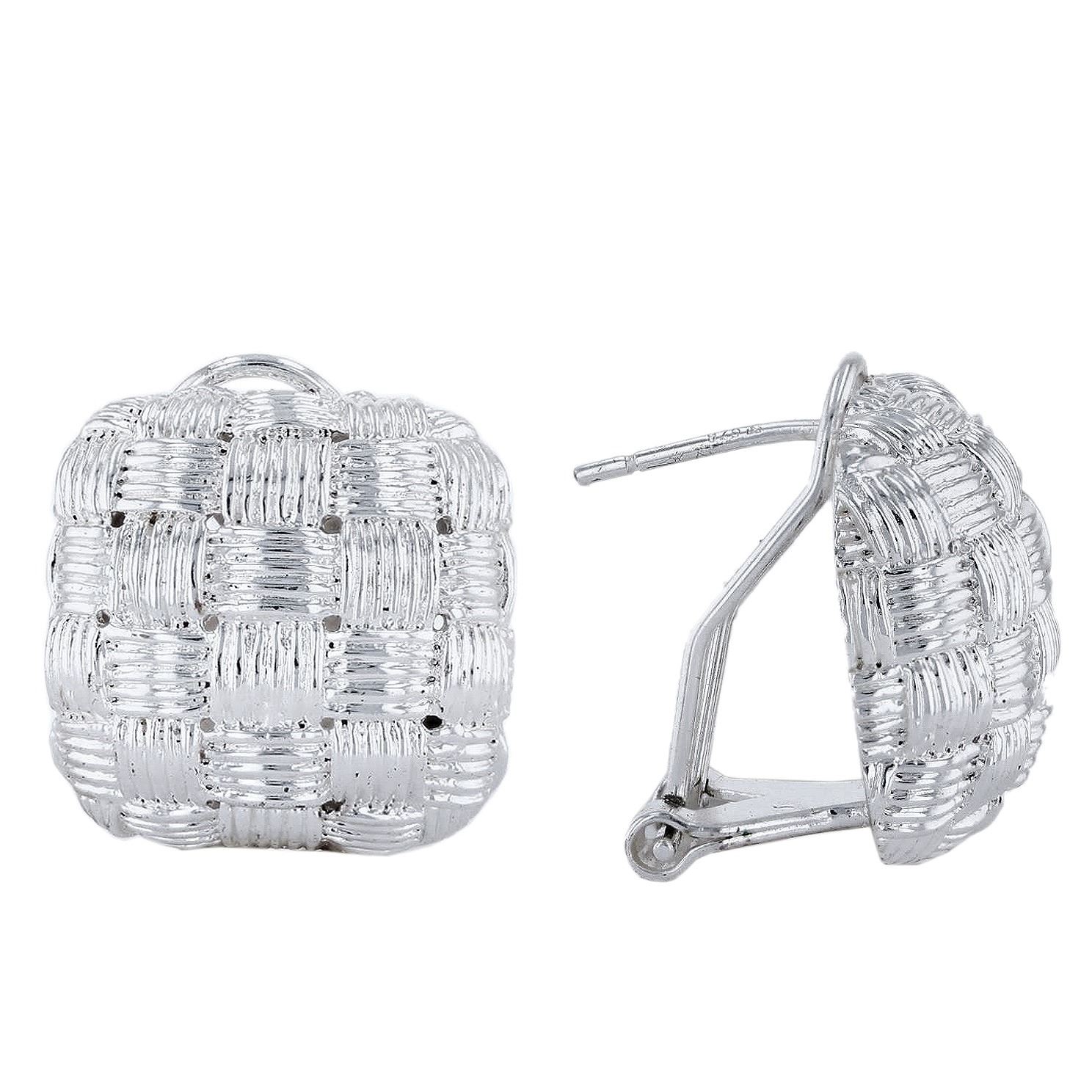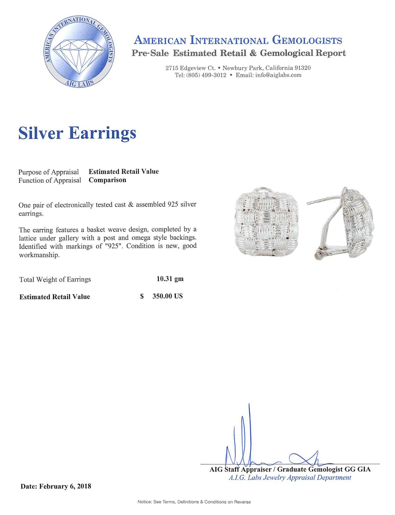 One SILVER Earrings. One pair electronically tested 925 silver ladies cast & assembled basket weave design earrings. The earring features basket weave design, completed by a lattice under gallery with a post and omega style backings. Identified with markings of "925". Condition is new, good workmanship. Total Weight of Earrings 10.31 gm.