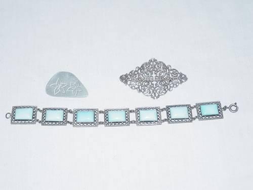 SILVER FILIGREE PIN and STERLING BRACELET W/ BLUE GLASS LINKS - CZECHOSLOVAKIA;