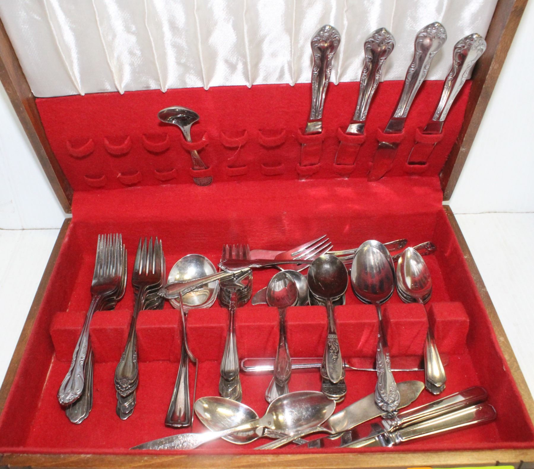 WOODEN CASE CONTAINING SILVER FLATWARE **ALL ITEMS MUST BE REMOVED BY 5PM FRIDAY, AUGUST 12TH, 2022. ALL REMAINING ITEMS WILL BE SUBJECT TO A $6.00 PER DAY STORAGE CHARGE. ANY ITEMS REMAINING AFTER FRIDAY, SEPTEMBER 2, 2022 WILL BE CONSIDERED FORFEITED. NO REFUNDS WILL BE ISSUED FOR FORFEITED ITEMS.** TO SCHEDULE A PICK UP APPOINTMENT. CLICK HERE