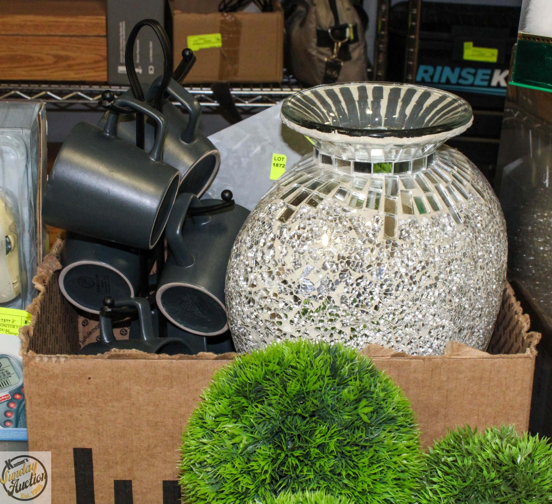 SILVER GLASS VASE, METAL MAILBOX AND 6 MUG TREE