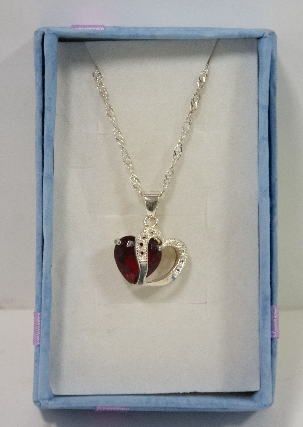SILVER .925 HEART WITH HEART SHAPED RUBY RED CZ PENDANT ON A 20" SILVER .925 CHAIN, PENDANT 0.75" LONG AND 5/8" WIDE