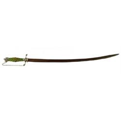 SILVER HILTED LION HEADED SMALL SWORD. 25" blade, 31" overall. British circa 1760-1790. Pommel exhibits lion head with chain running from mouth to cross guard. Cross guard quillions are figural heads. Cross guard exhibits floral motifs with dogs. Grip is green dyed ivory, spiral cut. CONDITION: Blade is gray with scattered pitting. Hilt and grip are very good. Chain appears to be modern replacement. 4-53488 JS10