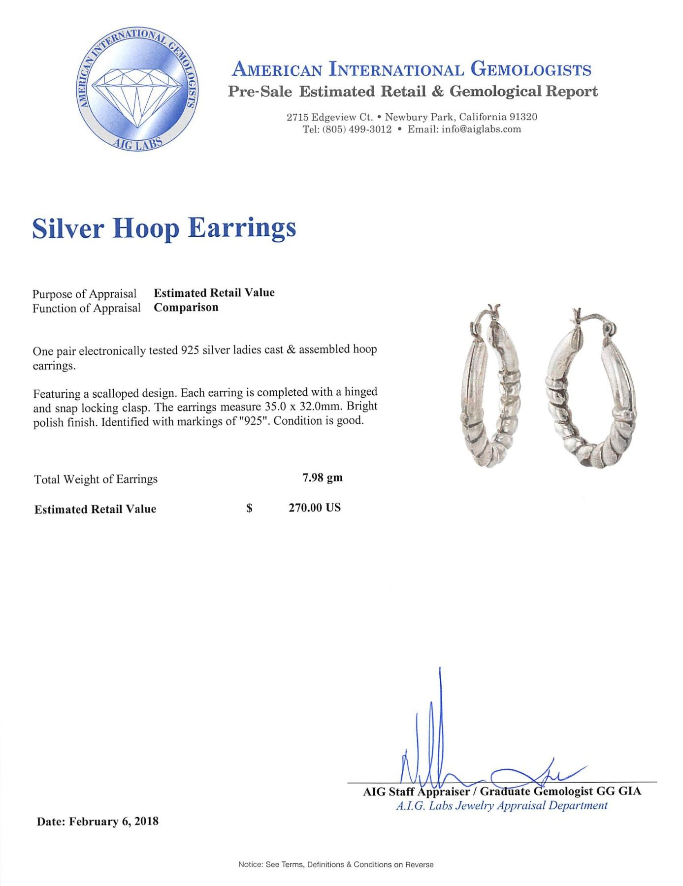 One SILVER Hoop Earrings. One pair electronically tested 925 silver ladies cast & assembled hoop earrings. Featuring a scalloped design completed with a hinged and snap locking clasp. The earrings measure 35.0 x 32.0mm width. Bright polish finish. Identified with markings of "925". Condition is good. Total Weight of Earrings 7.98 gm.