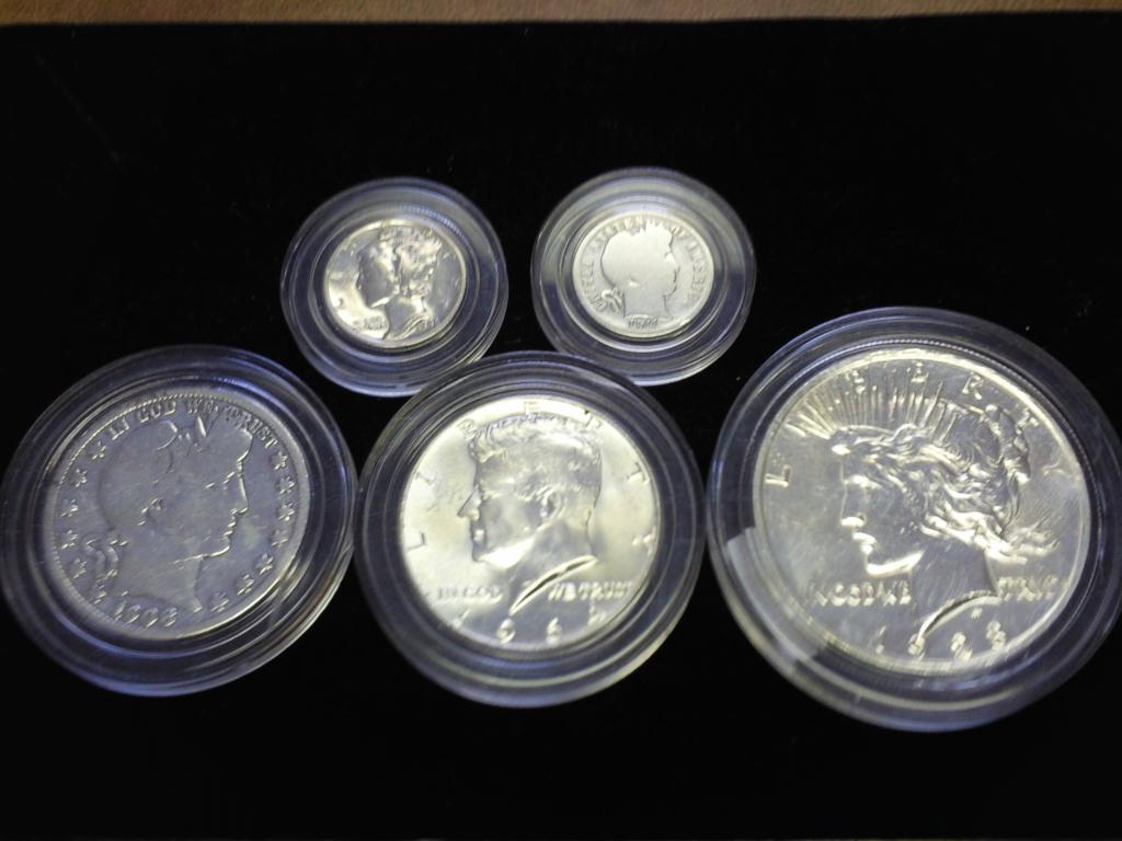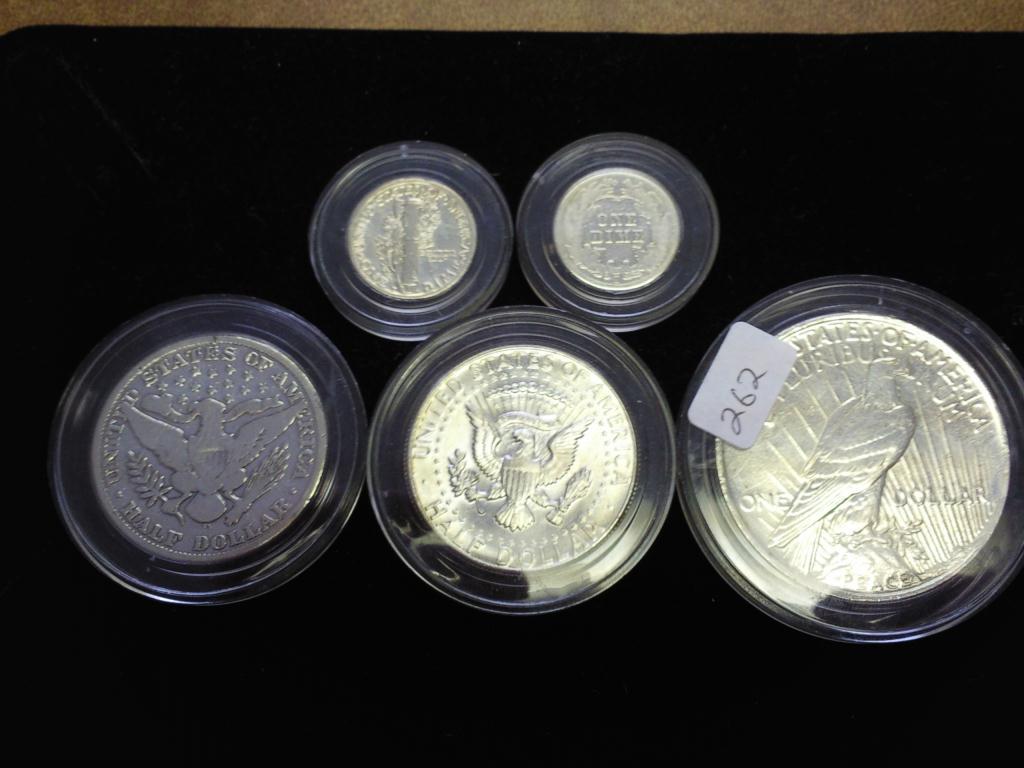 1911-S BARBER DIME, 1945-D MERCURY DIME, 1908-D BARBER HALF DOLLAR, 1964 KENNEDY HALF DOLLAR AND 1923 PEACE SILVER DOLLAR, POLISHED