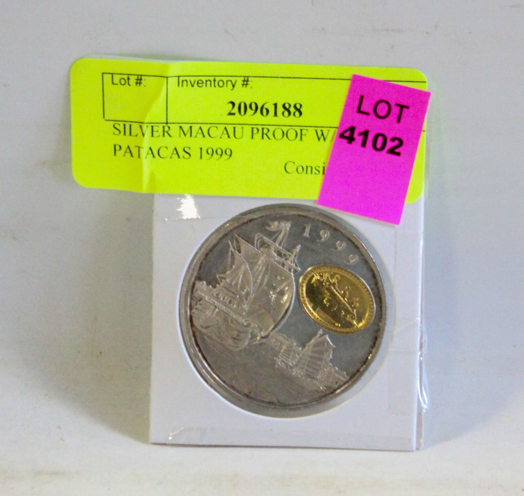 SILVER MACAU PROOF W/GOLD 100 PATACAS 1999